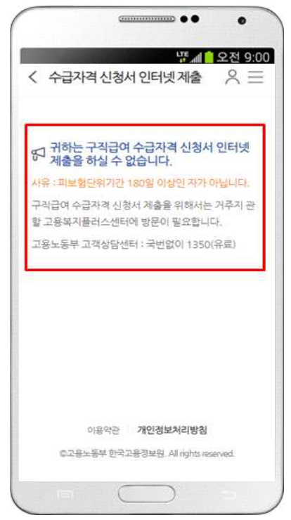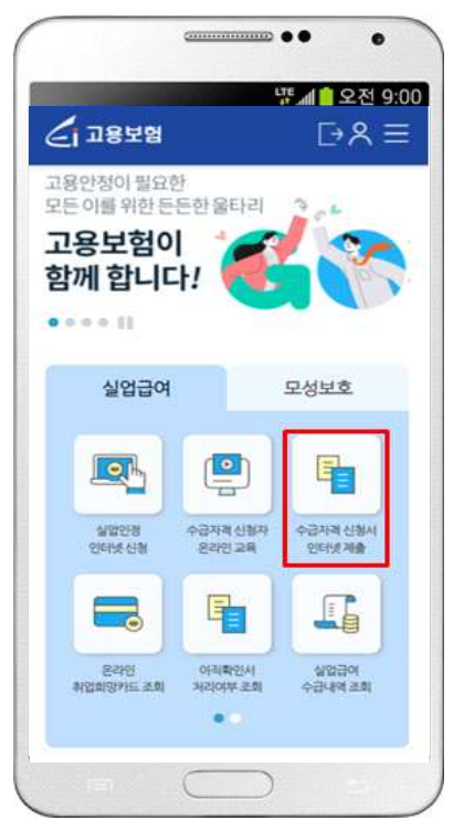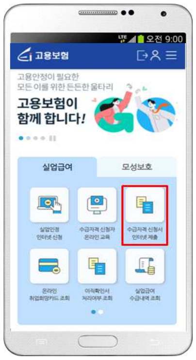 - 고용보험 모바일 앱 메인 화면의 '수급자격 신청서 인터넷 제출' 이미지를 선택합니다