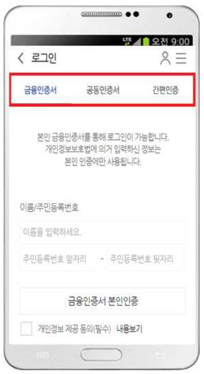 - 별도의 회원가입 없이 '금융인증서', '공동인증서', '간편인증'으로 로그인 가능합니다.