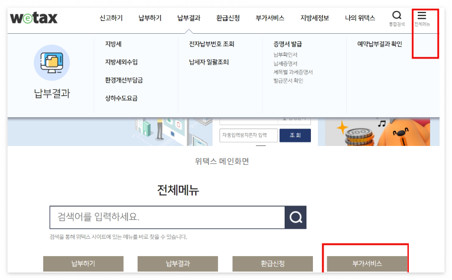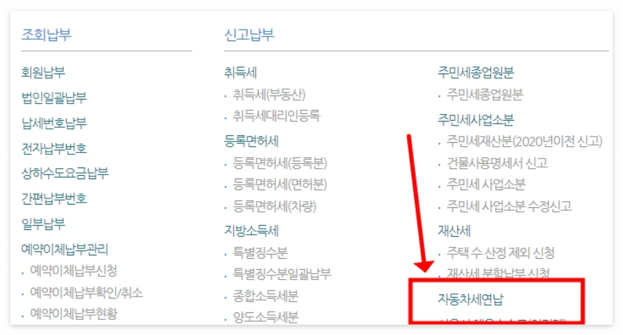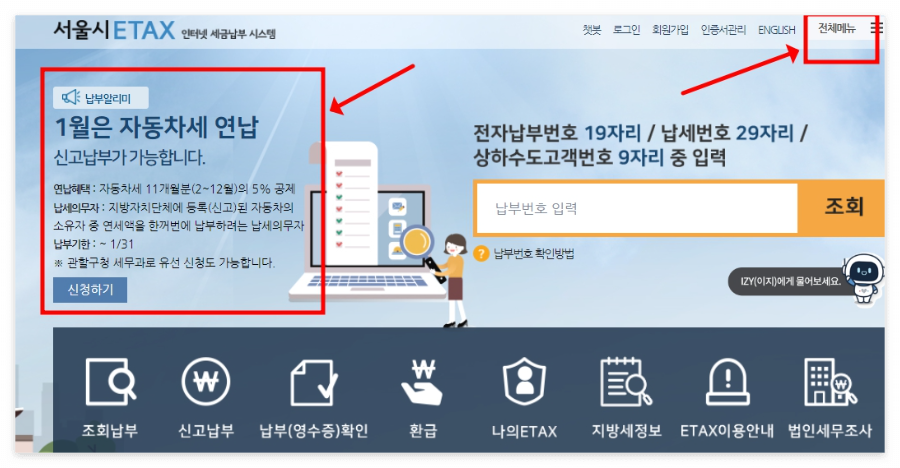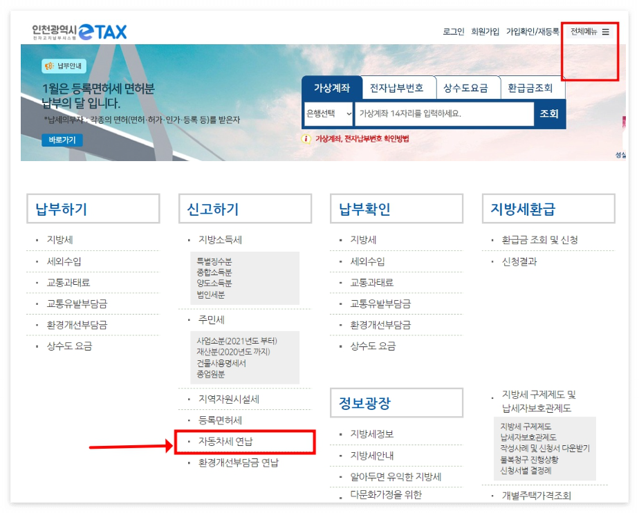 회원인 경우 로그인 → 우측 상단의 전체메뉴 → 부가서비스 → 자동차세 연납 신청 클릭