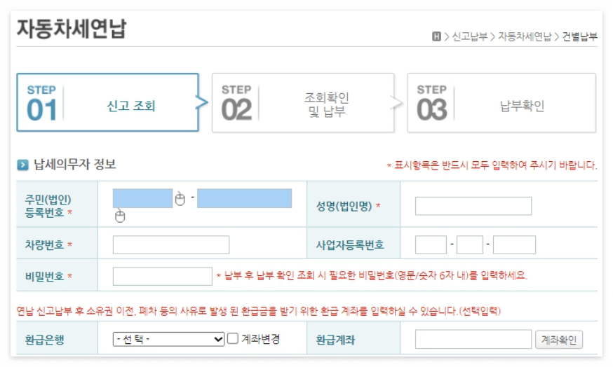 자동차세연납 신청 시 납세의무자 정보를 입력 후, 환급은행과 계좌를 기입합니다.